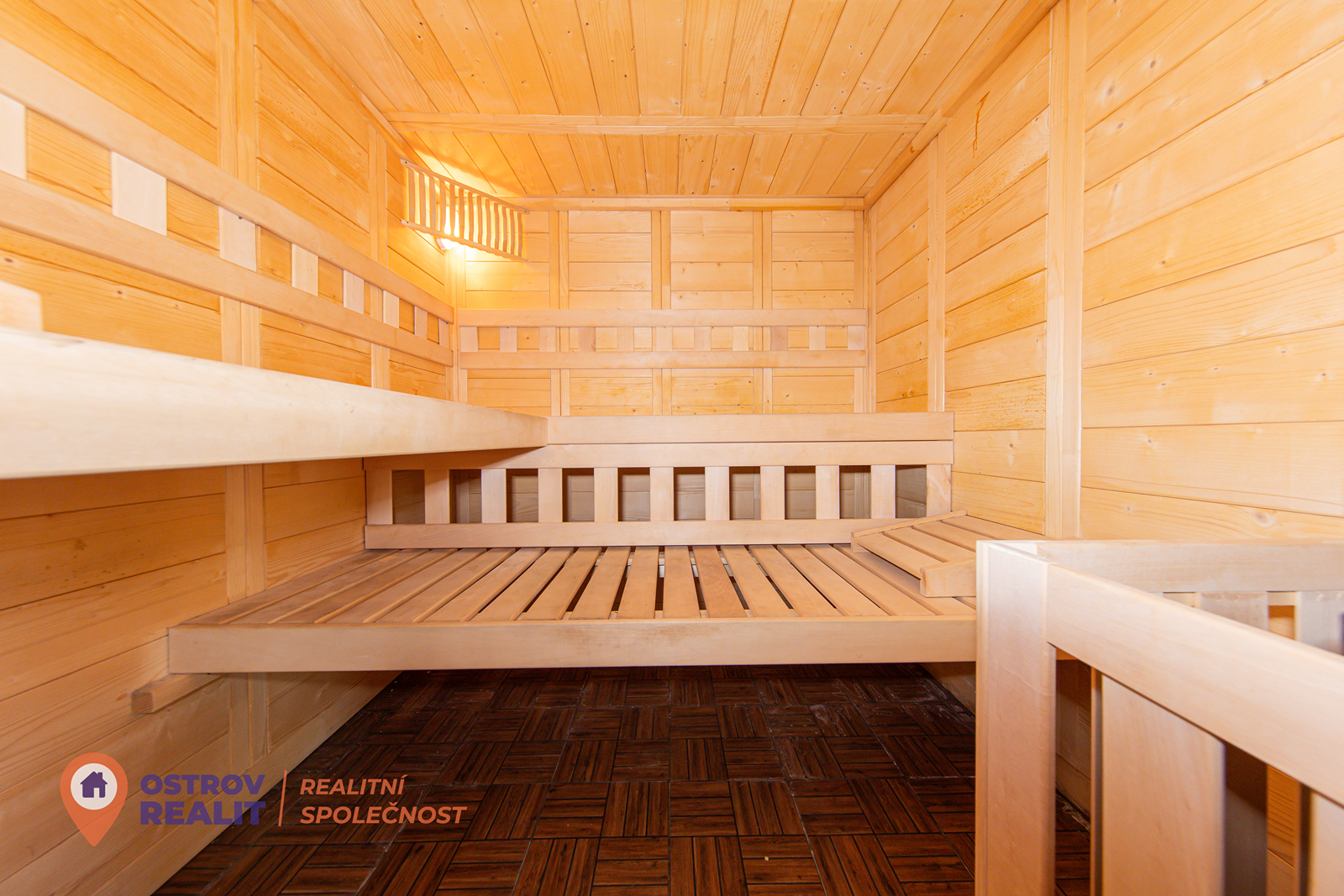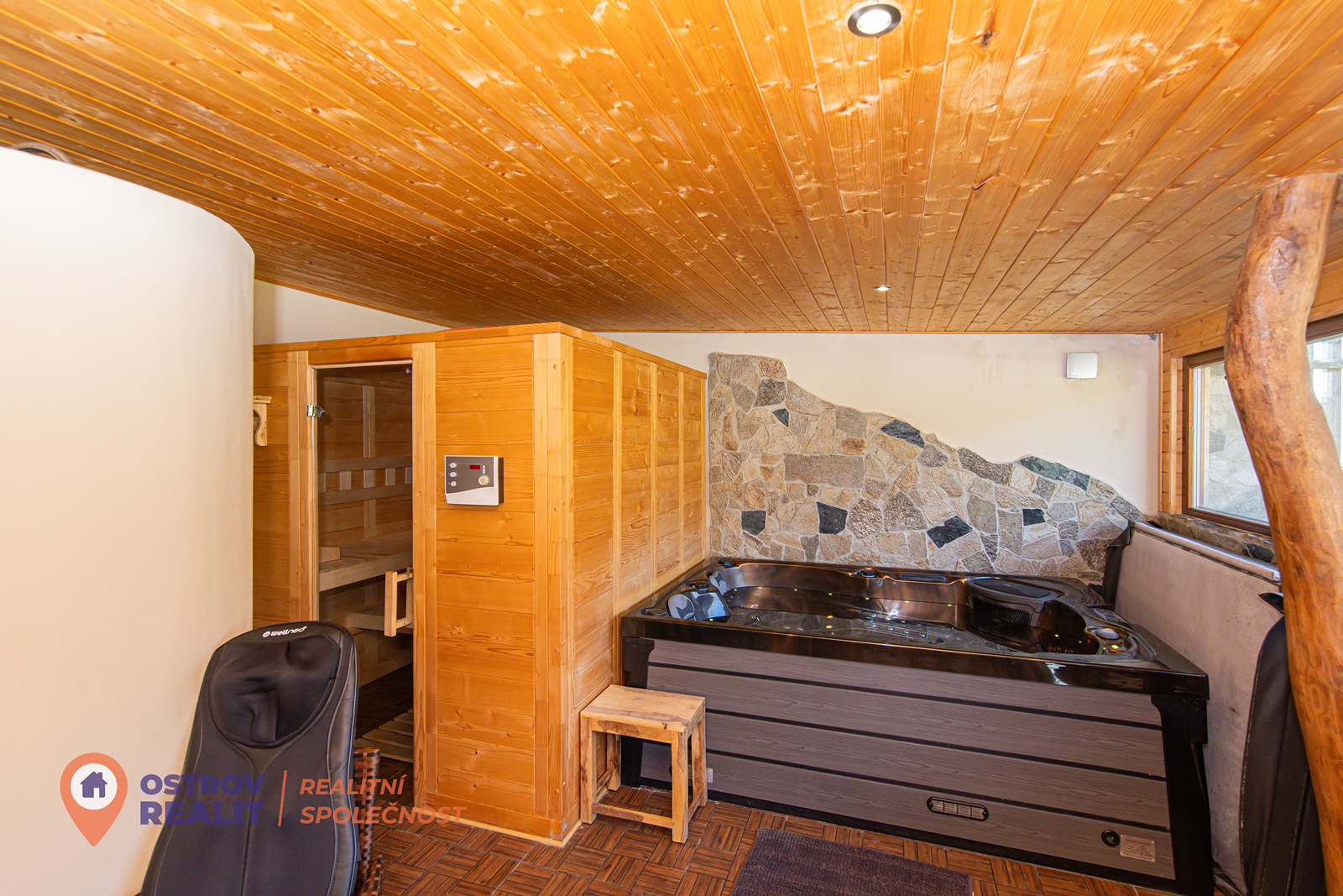 Nově vybudovaná wellness zóna (finská sauna, vířivka, sprcha, odpočívárna, vstup do zahrady, ochlazovací sud)