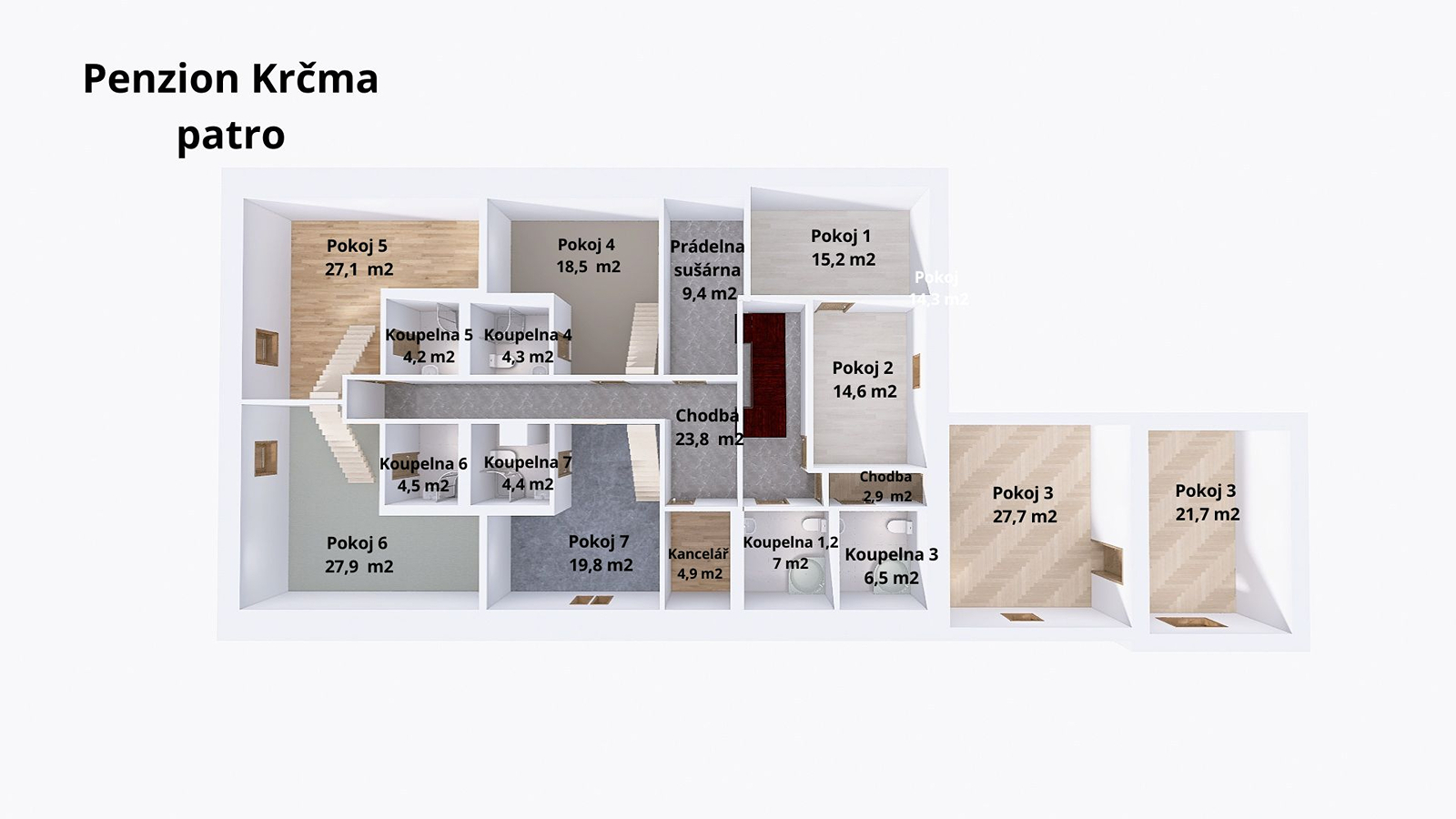 Rozsáhlá modernizace interiérů v roce 2021 –částečně nové rozvody, rekonstrukce kuchyně, pokojů, koupelen, vybudování wellness zóny