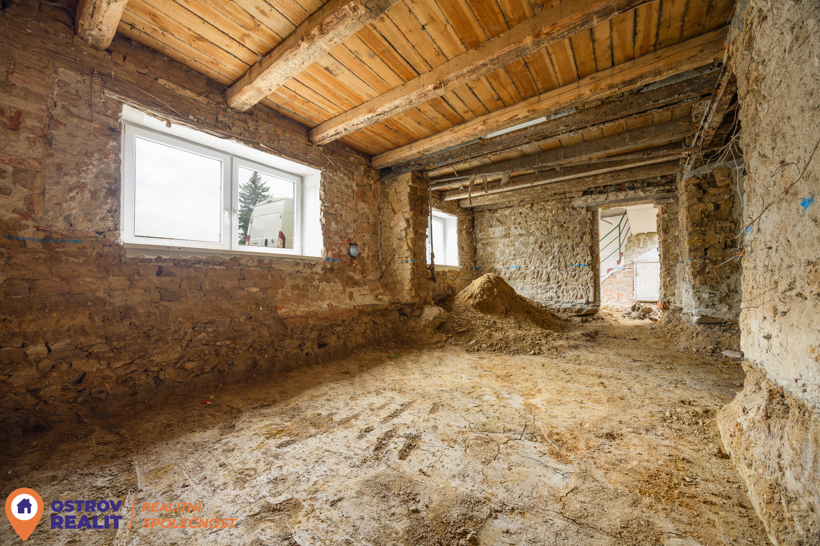 Dům je již částečně připravený na rekonstrukci – ve spodním patře jsou osekané omítky, vybraná podlaha a prostor je nachystaný pro novou realizaci.