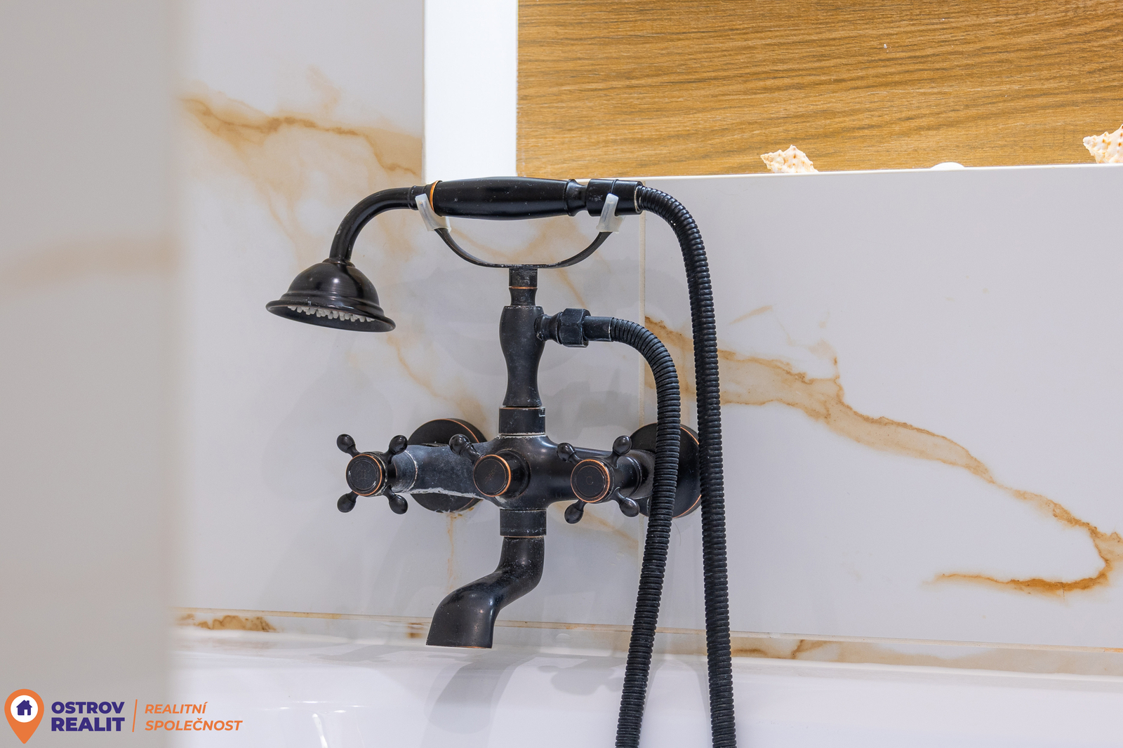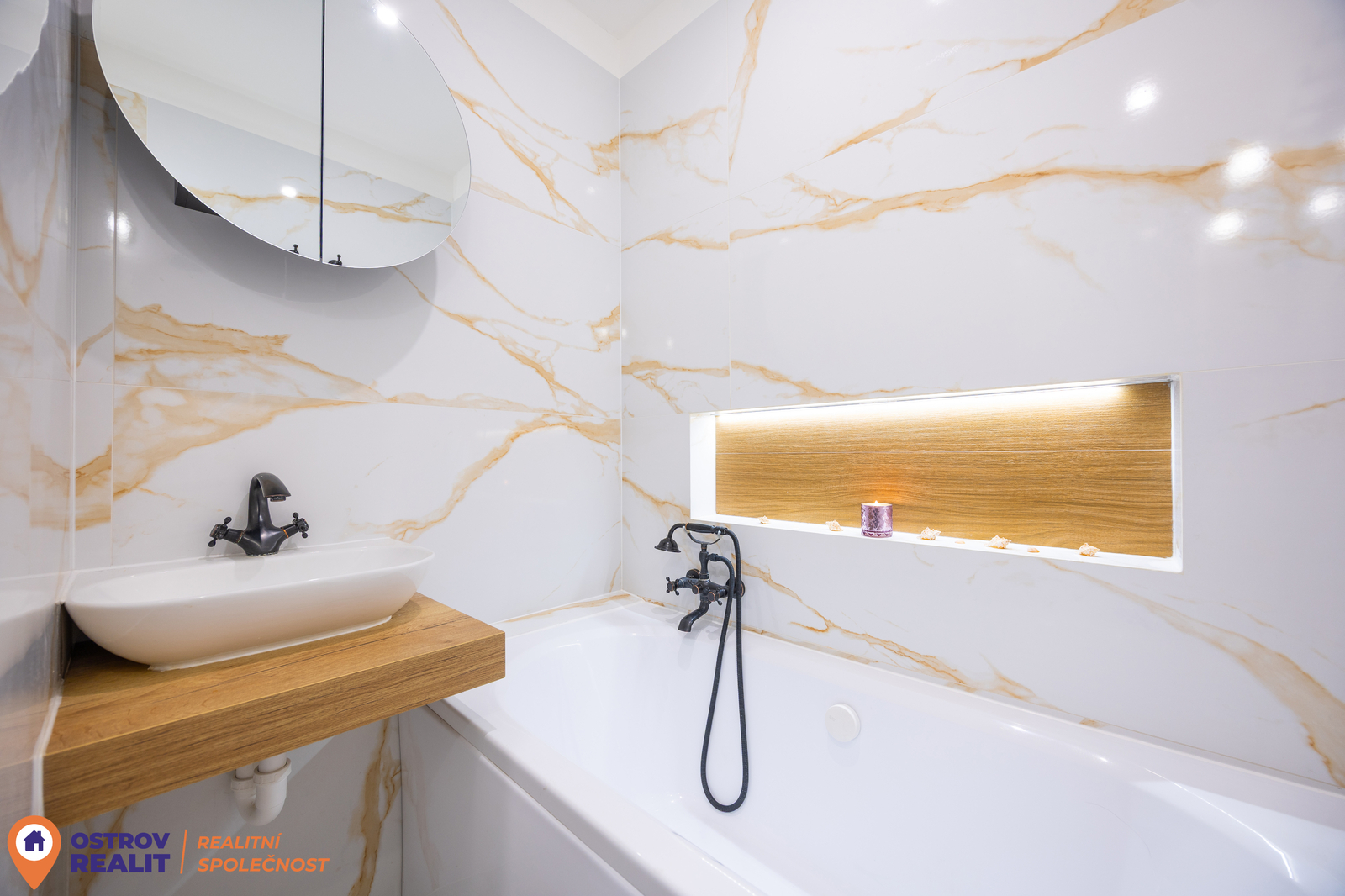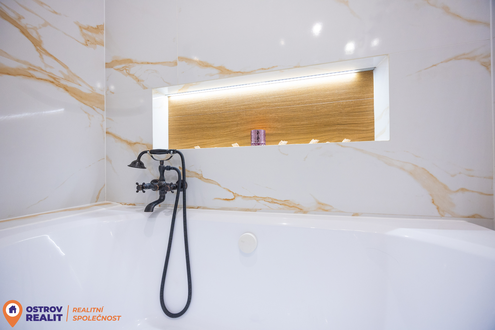 Koupelna byla vkusně zrekonstruována – má obklady v neutrálních barvách, novou sanitární techniku a rohovou vanu, která působí elegantně a čistě.