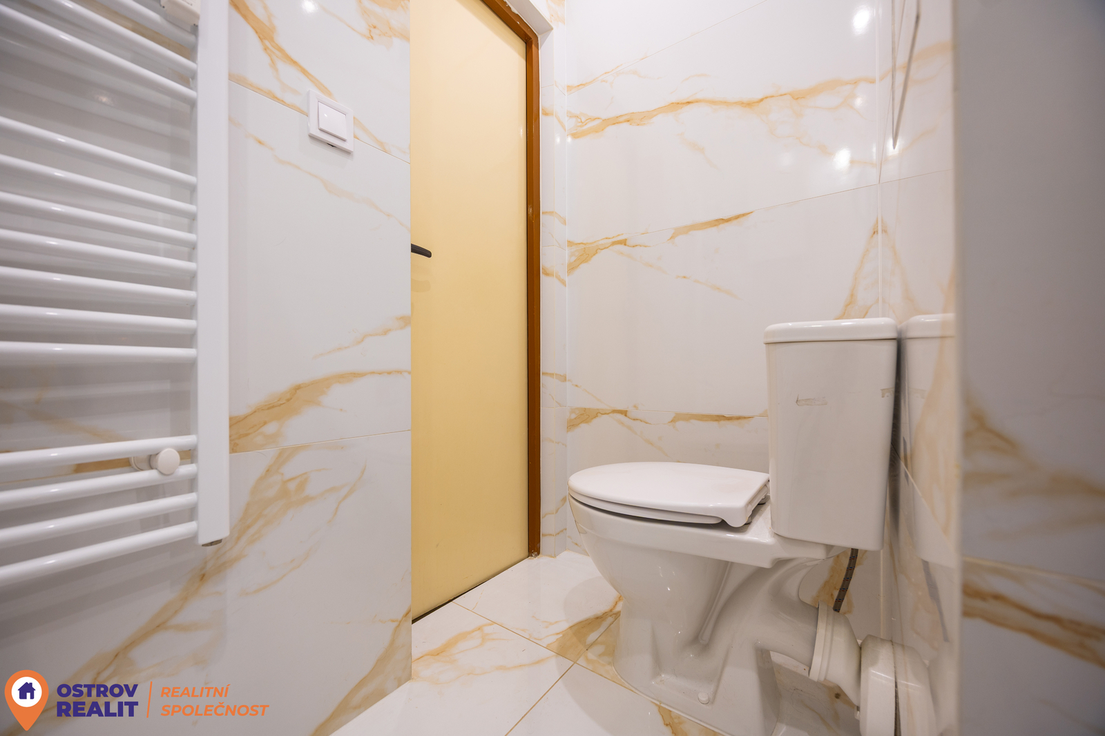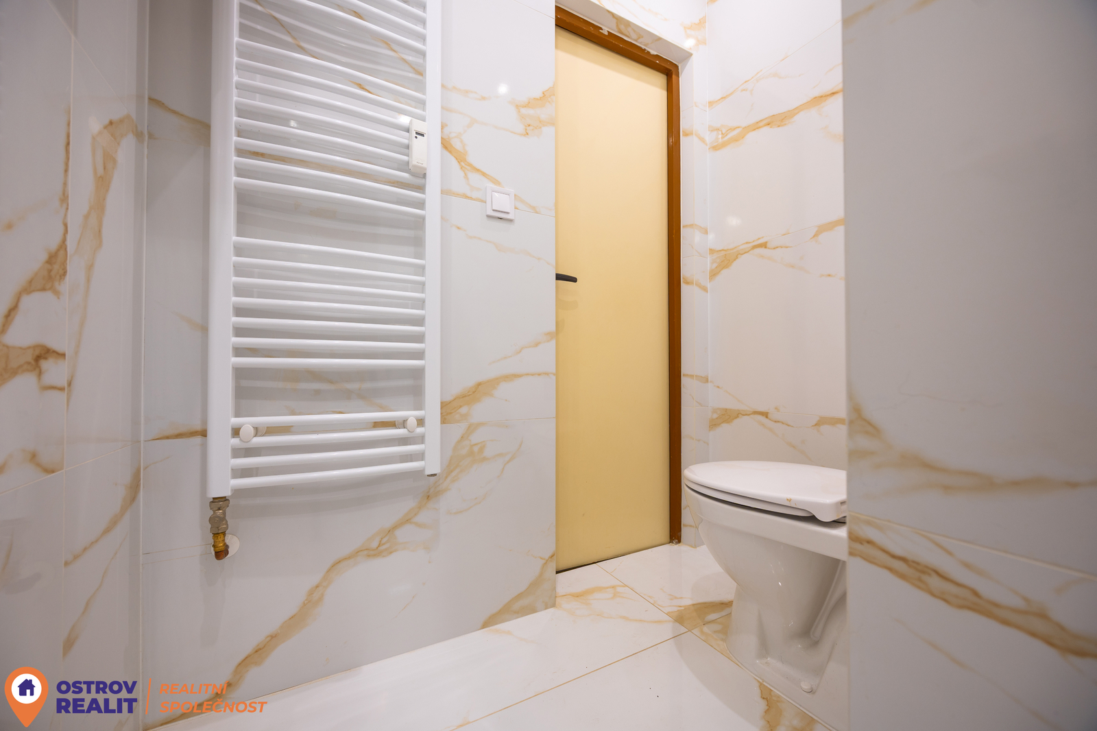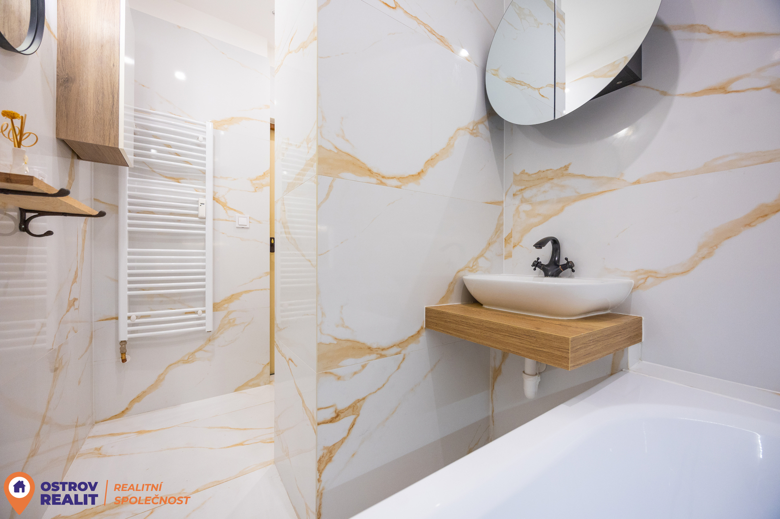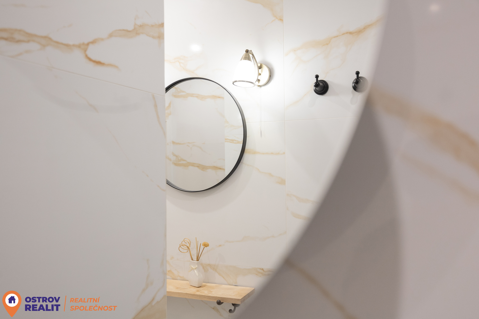 Koupelna byla vkusně zrekonstruována – má obklady v neutrálních barvách, novou sanitární techniku a rohovou vanu, která působí elegantně a čistě.
