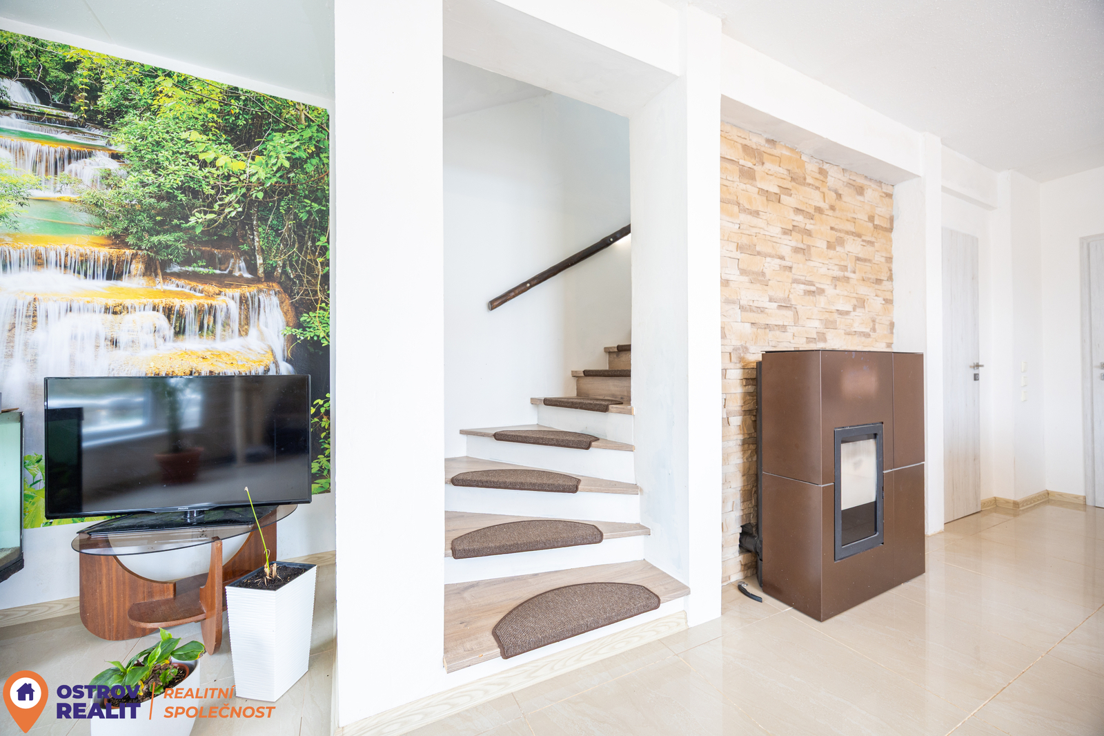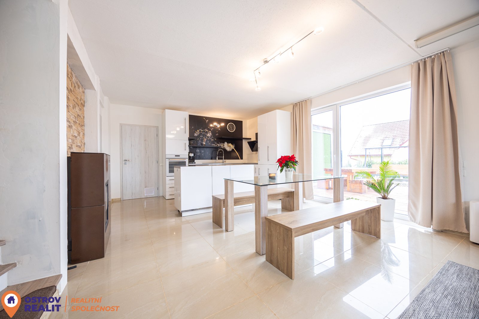 V obývací místnosti jsou automatická krbová kamna na peletky, která slouží jako hlavní zdroj vytápění a zajišťují velmi úsporný provoz.